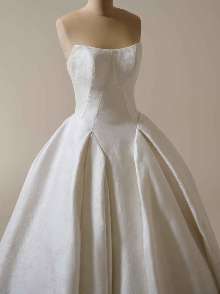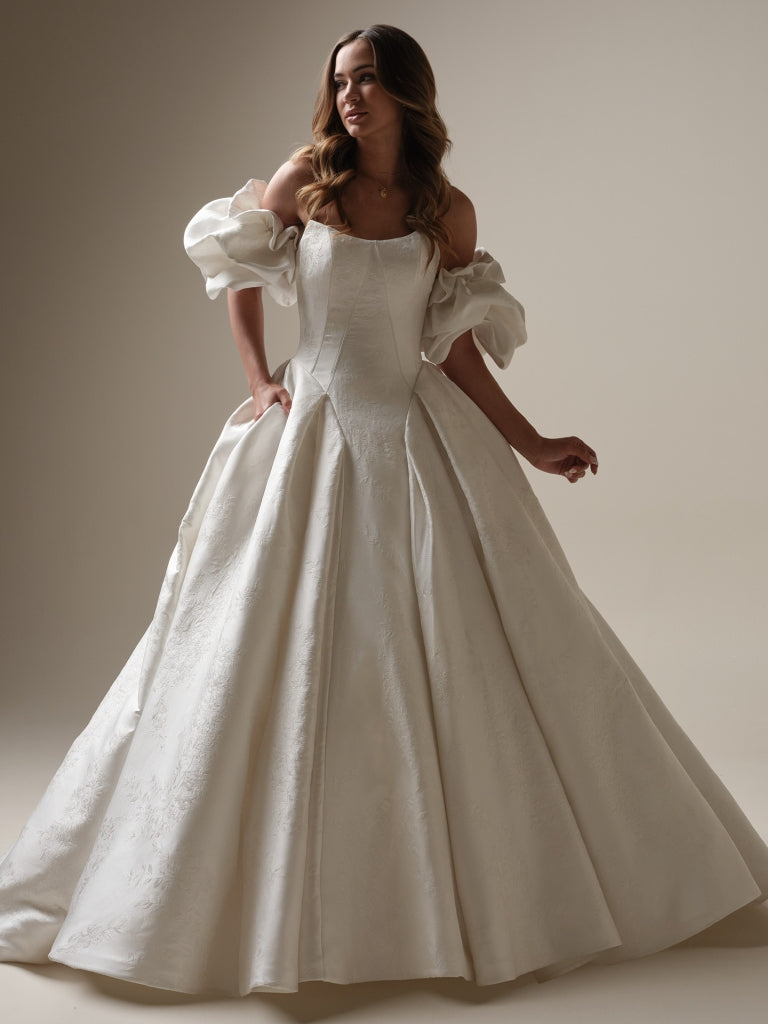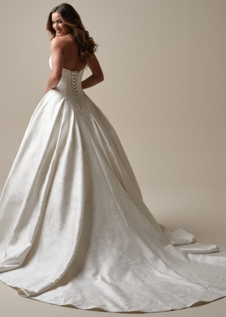 Experience luxury with every step in this stunning Jacquard Fabric ball gown. The intricate topstitch corset detail on the bodice adds a touch of elegance, while the lace-up corset closure ensures a perfect fit. And for added convenience, this dress even comes with pockets! With its timeless silhouette and chapel train, the Maggie Sottero Fortune Marie wedding dress truly offers the best of both style and functionality.