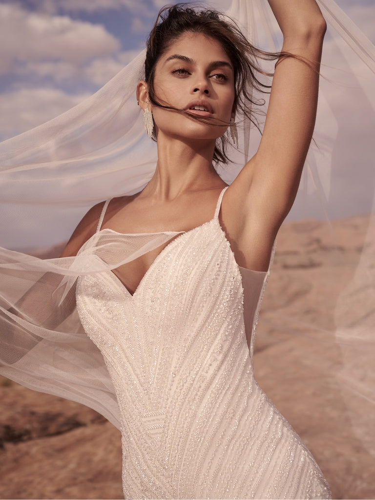 Captivate your guests with Boston 22SK985, a beaded statement bridal gown with old-Hollywood vibes.
